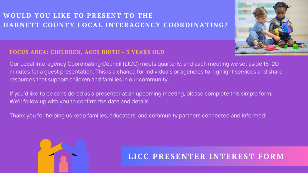 We’ve got a fantastic lineup of presenters ready to share valuable resources, insights, and updates. These meetings are more than just presentation! They’re a space to ask questions, network, share your own information and celebrate the important work you're doing with children and families in our community.